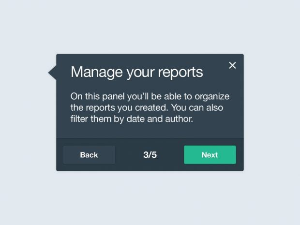 In manchen Fällen willst du vielleicht einen virtuellen Walkthrough durch eine spezifische Anwendungssituation machen. Hier kommt den Tooltips eine regelrecht schulende Funktion zu. In diesem Fall wirst du weit obstruktiver gestalten wollen und etwa dafür sorgen, dass der Benutzer einen Tooltip erst dann schließen kann, wenn er die darin vorgegebene Aufgabe (beipielsweise klicke XYZ an) erledigt hat. Bei dieser Form von Tooltips empfiehlt es sich zudem, innerhalb der kleinen Infoboxen anzuzeigen, an welchem Punkt der Tour der User sich gerade befindet.