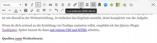 Auf der anderen Seite gibt es Situationen, bei denen On-Hover am besten funktioniert. Das ist etwa da der Fall, wo der Tooltip lediglich eine Funktion erklären soll, die durch ein Icon schon hinreichend erklärt wird. Als Beispiel können die Formatierungswerkzeuge des TinyMCE gelten.
