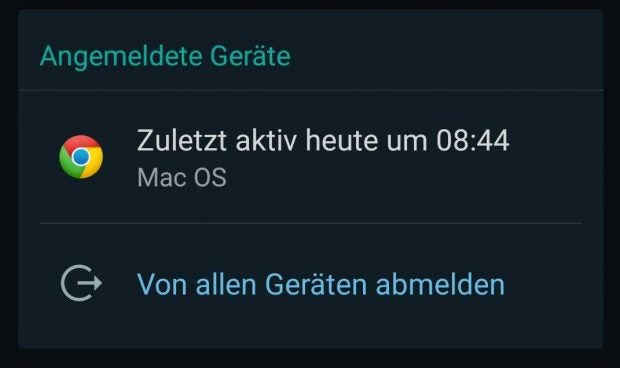 Außerdem lässt sich leicht überprüfen, ob Whatsapp mit dem Web-Interface verbunden ist. Dazu müsst ihr in der Chat-App lediglich ins Menü und dort auf Whatsapp Web gehen. Sollte Whatsapp mit einer oder mehreren Browser-Instanzen verbunden sein, wird euch das hier angezeigt. Mit einem Klick auf Von allen Geräten abmelden unterbrecht ihr diese Verbindungen.