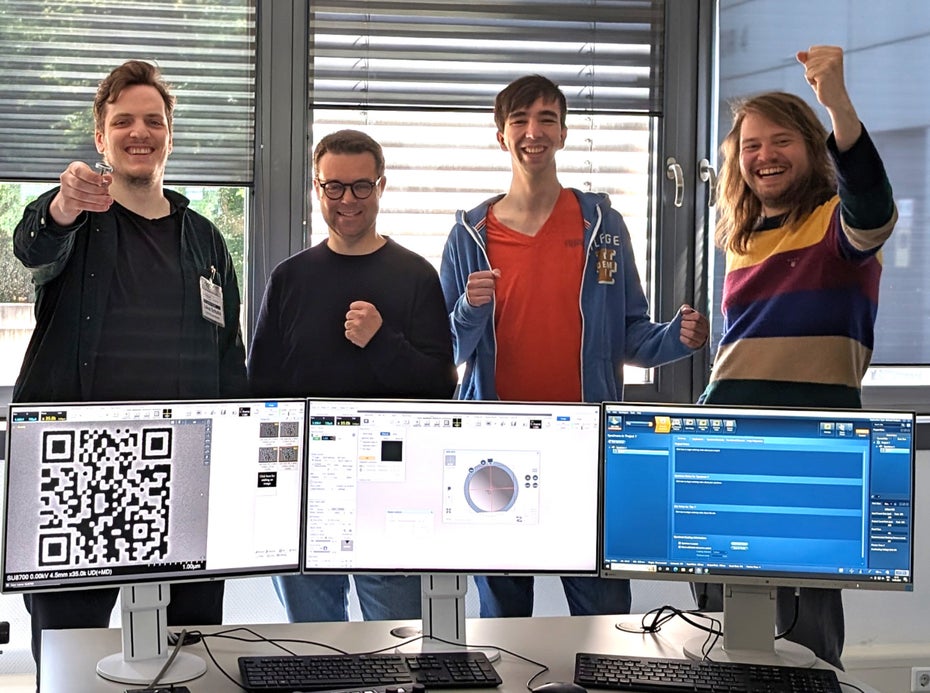 Die Wissenschaftler der Universität Münster, die den kleinsten QR-Code der Welt erzeugt haben: Lukas Schulte, Professor Carsten Schuck, Tim Buskasper und David Lemli (v.l.). (Mit freundlicher Genehmigung, Bildquelle: MNF – Maik Stappers)