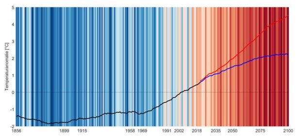 Die schwarze Linie zeigt die gemessenen Werte bis 2020. Die rote und blaue Linie zeigen die weitere Temperaturentwicklung basierend auf zwei verschiedenen Klimaszenarien. In der „Apptauen“-Anwendung ist zu sehen, dass das Eis am Dachstein Gletscher innerhalb der kommenden Jahrzehnte nahezu komplett verschwinden könnte.