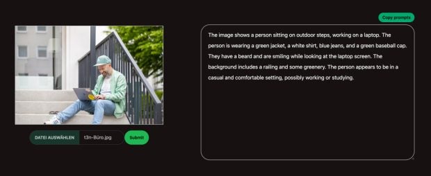 Bei unserem Versuch weigerte sich Imagetoprompts allerdings, mit zu großen Bilddateien zu arbeiten. Eine Fehlermeldung gab es indes nicht. Der Dienst versagte ohne Erklärung. Erst auf ein kleineres Format heruntergerechnet klappte es dann.