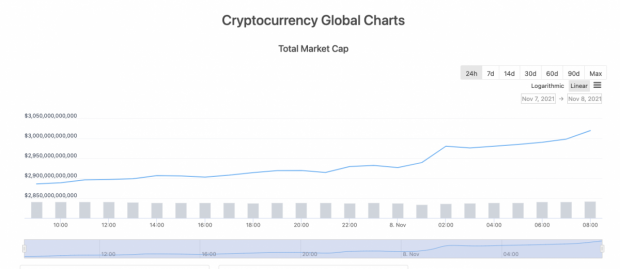 Zum ersten Mal liegt die kumulierte Marktkapitalisierung aller Kryptowährungen am Markt bei über drei Billionen US-Dollar. Das gibt die Seite Coingecko an. Demnach hat die Marktkapitalisierung gegen 8 Uhr am Montagmorgen die Drei-Billionen-Grenze überschritten. Coingecko zieht für die Statistik etwa 10.450 digitale Assets an 518 Kryptomarktplätzen weltweit heran.