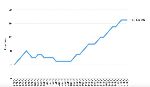 Die Lebensdauer bei Dediu berücksichtigt übrigens – anders als die von Apple angegebene Nutzungszeit der Erstkäufers – die Weiterverwendung durch andere Nutzer. Denn bei der Berechnung geht es um die Geräte, die bei Apple als „aktiv“ gemeldet werden. Interessant ist zudem, dass die von dem Analysten berechnete Lebensdauer in den vergangenen Jahren deutlich angestiegen ist. Im Vergleich zum Frühjahr 2008 hat sich die Lebensdauer auf 17 Quartale Ende des vergangenen Jahres mehr als vervierfacht.