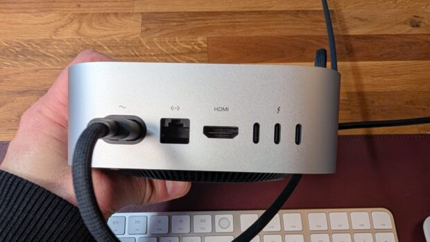 Mit der kleineren Bauform hat Apple sich von Altlasten wie dem USB-Typ-A-Anschluss getrennt, dafür aber zwei USB-C-Ports und eine Audiobuchse auf die Vorderseite verfrachtet. Damit ist es ähnlich wie beim Mac Studio einfacher, externen SSDs oder USB-Sticks mit dem Rechner zu verbinden. Rückseitig sind dennoch Ports wie drei USB-C-Buchsen mit Thunderbolt 5 (beim Modell mit M4 ist es nur Thunderbolt 4), HDMI und ein Ethernet-Adapter mit einem oder optional zehn Gigabit pro Sekunde vorhanden.