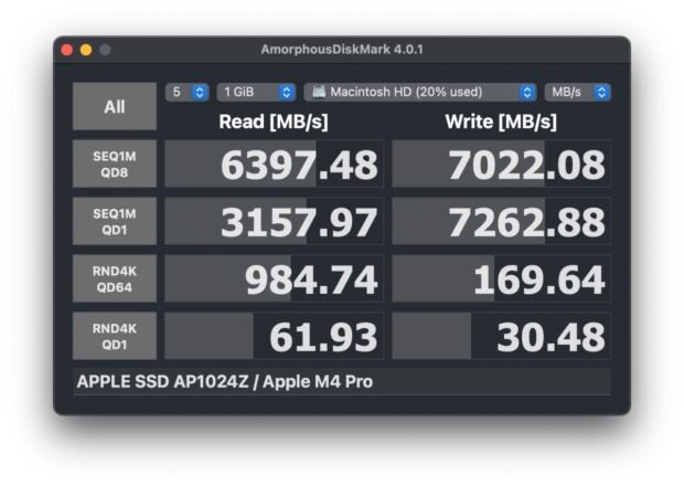 Bei der Lese- und Schreibleistung der verbauten Apple-SSD mit 2 Terabyte können wir schnelle Transfers messen: Beim Lesen per Amorphus-Diskmark können wir 6.937,48 sequentielle Lese- und 7.022 MB/s Schreibvorgänge erzielen.