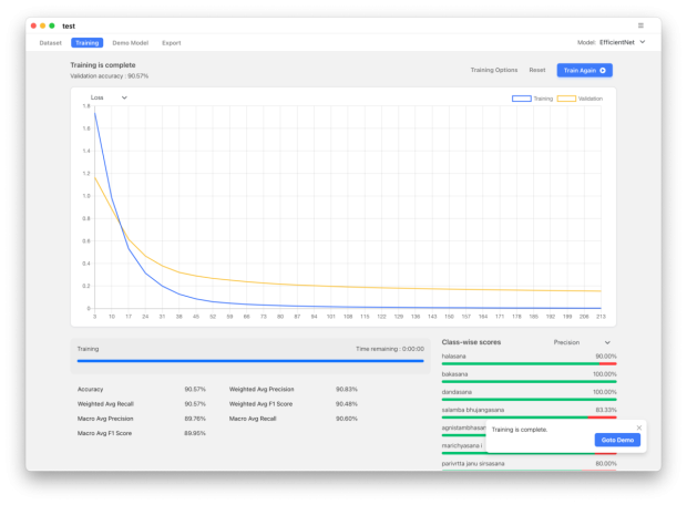 In den Standardeinstellungen sollte das Training nach wenigen Minuten abgeschlossen sein und ihr könnt euer neu trainiertes Modell direkt in der App ausprobieren. Im Fall der Yogaposen-Erkennung könnt ihr dann beispielsweise ein Yoga-Bild aus dem Netz herunterladen und per Drag-and-drop auf Liner.ai ziehen. Die App führt das Modell dann aus und sollte euch dann anzeigen, welche Pose darauf zu sehen ist. Alternativ könnt ihr an der Stelle aber auch direkt eure Webcam benutzen, um ein Bild zu machen.