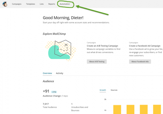 Ab sofort findet jeder Mailchimp-Nutzer in der oberen Menüleiste den Punkt Automation. (Screenshot: t3n)
