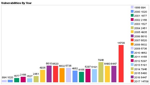 Die Anzahl der insgesamt in 2017 entdeckten Sicherheitslücken befindet sich laut CVE-Details auf Rekordniveau. Der Website zufolge wurden im vergangenen Jahr 14.709 CVE-Nummern ausgegeben. In den Jahren zuvor wurden weit weniger Schwachstellen gemeldet.