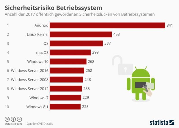 Android hat sich 2017 eine vermeintlich unrühmliche Krone geholt: 2017 wurden insgesamt 841 Schwachstellen in dem Betriebssystem gefunden und dokumentiert, die höchste Zahl an Sicherheitslücken eines Betriebssystems im vergangenen Jahr. Das geht aus einer Statista-Grafik mit einer Top Ten der Betriebssysteme mit den meisten Sicherheitslücken hervor. Die Daten stammen von der Website CVE-Details. An zweiter Stelle des Rankings befindet sich kein OS, sondern der Linux-Kernel mit 453 Sicherheitslücken, an Platz drei und vier sind Apples iOS und macOS mit 387 respektive 299 Lücken.