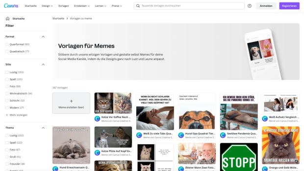 Canva: Auch über das Design-Programm Canva lassen sich Memes erstellen. Die Website bietet mehrere Vorlagen, die angepasst werden können. Die Beispiele können auch Inspirationen für eigenen Memes liefern. Um die Vorlagen anzupassen, ist nicht unbedingt eine Anmeldung nötig. Um alle Funktionen nutzen zu können, braucht es sie jedoch.