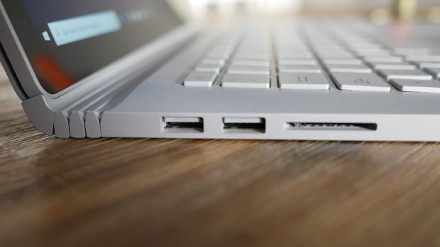 Während der USB-C-Port auf der rechten Gehäuseseite neben dem Microsoft-Connector verortet ist, sitzen auf der gegenüberliegenden Seite zwei USB-Typ-A-Anschlüsse mit USB 3.0 und – erfreulich – ein SD-Kartenleser, der seine Dienste bestens verrichtet.