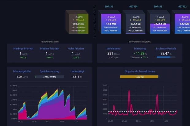 Der Energiebedarf des Bitcoin-Netzwerks entsteht im Wesentlichen bei den weltweit verteilten Mining-Betrieben (Rechenzentren). Diese Hallen sind mit Spezialrechnern bestückt, sogenannten Mining Rigs, die wiederum mit speziellen ASICs (Applikationsspezifische ICs) bestückt sind. Solche Rechner können mit einer unvorstellbaren Geschwindigkeit nur eine ganz bestimmte Rechenoperation ausführen: den sogenannten Hash-Wert eines neuen Datenblocks (der circa 2.000 Überweisungen enthält) für die Blockchain-Datenbank ermitteln. Diesen Prozess kann man im Prinzip live verfolgen, siehe Bild 1.