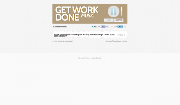Mit seinem schlichten, unkomplizierten Interface und der angebotenen Elektro-Mucke, die von treibendem Techno zu harmonischem Deep-House reicht, ist Get Work Done Music bestimmt nicht das Richtige für alle. Praktisch ist dabei, dass ihr den Dienst komplett kostenlos im Browser nutzen könnt – also einfach mal ausprobieren! Mehr als die Lautstärke könnt ihr dabei nicht einstellen. Außerdem könnt ihr manuell Songs überspringen oder Get Work Done Music per Knopfdruck wissen lassen, dass ihr nun bitte eher schnelle oder doch noch schnellere Musik hören möchtet.