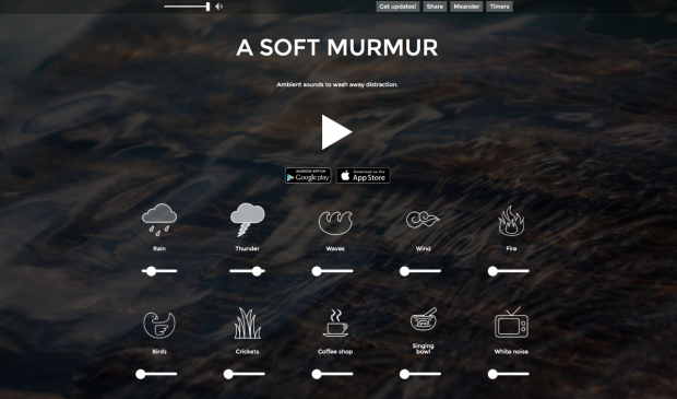 Sehr ähnlich wie bei Noisli bekommt ihr bei A Soft Murmur ein Soundboard aus zehn frei konfigurierbaren Schnipseln – von Regengeräuschen über Vogelgesang und Klangschalen bis zum Lagerfeuer. Die bekommt ihr entweder direkt im Webbrowser oder einer zugehörigen App für iOS und Android. In der kostenpflichtigen Variante sind noch 13 zusätzliche Sounds an Bord. Über Schieberegler mischt ihr die einzelnen Geräusche individuell zusammen. Das „Meander“-Feature variiert per Knopfdruck zufällig die Lautstärke aller eingeschalteten Geräusche. Eure Mixes könnt ihr auch benennen und abspeichern oder sogar über soziale Medien teilen.