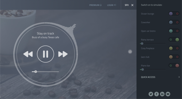 Der Name ist Programm – und Hipstersound scheint sich selbst nicht allzu ernst zu nehmen. Der Dienst bietet euch verschiedene Restaurant- und Café-Soundkulissen, zu denen ihr weitere Geräusche wie Regen und Kaminfeuer zuschaltet, aber auch lässige Jazz-, Piano- und Gitarrenmusik. Im kostenlosen Webdienst sind nur drei Umgebungen verfügbar, weitere bekommt ihr im Premium-Modell. Das bringt außerdem Zusatzfeatures wie einen Regengeräuschsimulator und einen Generator für Rauschen verschiedener Frequenzen.