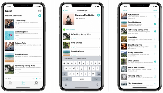 Seid ihr mit eurem iPhone oder iPad fleißig, oder habt es bei der Arbeit zumindest in eurer Nähe, könnt ihr mit der App Noise für produktive Arbeitsaudioatmosphäre sorgen. Aus zwölf verschiedenen Ambient Sounds wie plätscherndem Meeresrauschen, einem lauschigen Café oder Frühlingswind stellt ihr euch eure Kulisse zusammen. Möchtet ihr verschiedene Sound-Umgebungen für unterschiedliche Situationen, speichert ihr eure Zusammenstellungen als Mixtapes ab. Zusätzliche Geräusche sowie die Möglichkeit, Noise im Hintergrund laufen zu lassen, bekommt ihr als In-App-Kauf oder im Rahmen der Premium-Version, die außerdem Airplay unterstützt.