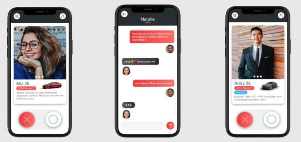 So könnten die Profile der beziehungssuchenden Tesla-Anhänger aussehen. (Grafik: Tesla Dating)