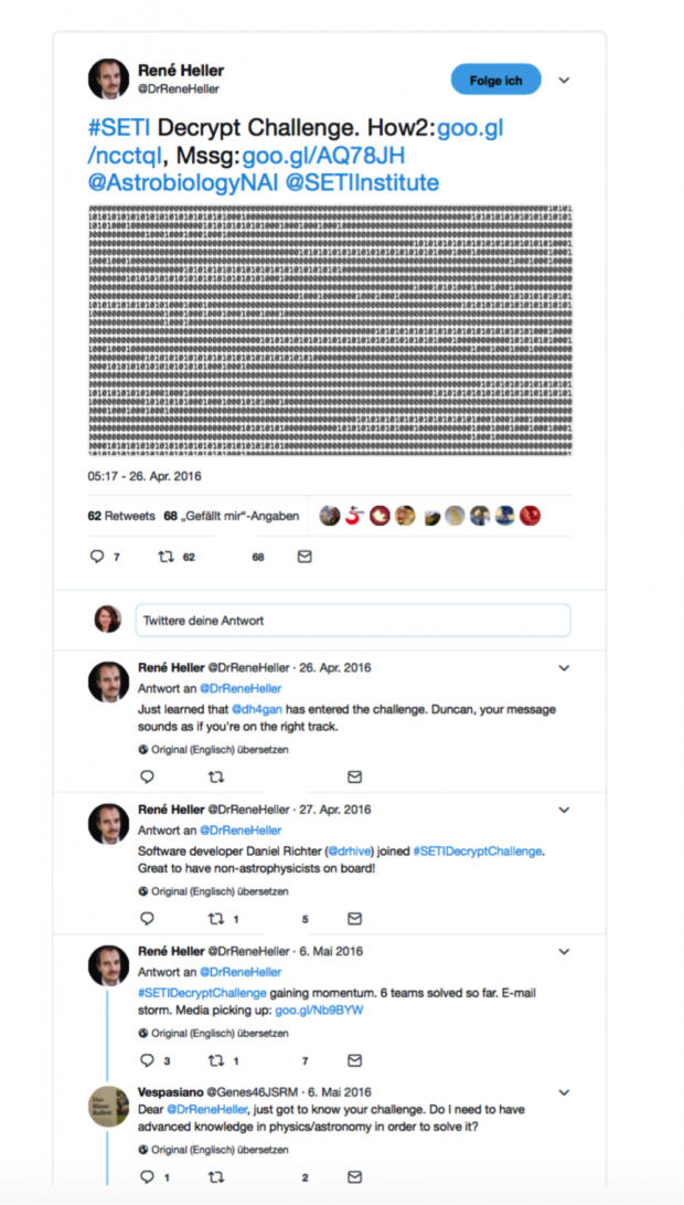 Alle Kollegen scheiterten. Selbst Nobelpreisträger. Vollständig entzifferte die Nachricht erst später ein Amateur-Code-Cracker. Er hatte die Nachricht in einem Magazin gelesen. Wie auch beim aktuellen Social-Media-Experiment zeigte sich also: Man muss kein Wissenschaftler sein, um (potentiell) mit Aliens zu kommunizieren.