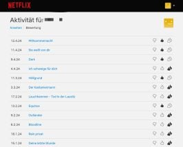 Wenn eure Freund:innen nicht erfahren sollen, was ihr euch heimlich auf Netflix angesehen habt, lassen sich die Spuren mit nur wenigen Klicks verwischen. Geht dazu in die Kontoeinstellungen und klickt auf den Bereich „Was Sie sich angesehen haben“. Dort werden alle Inhalte chronologisch nach Abrufdatum aufgelistet. Mit einem Klick auf das X auf der rechten Seite entfernt ihr den jeweiligen Titel aus eurer Historie. Dieser taucht anschließend nicht mehr in eurer Watchlist auf.