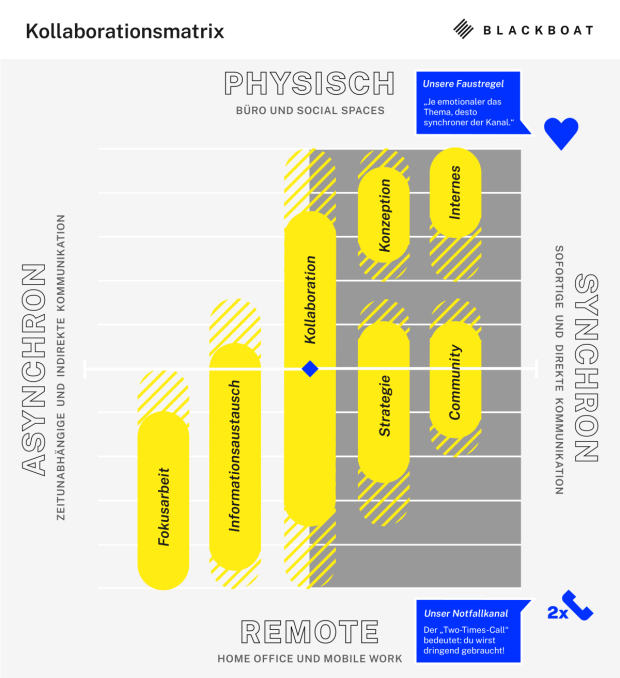 Die Kommunikationsmatrix haben wir bei Blackboat selbst im Einsatz und passen sie auch in Projekten immer wieder individuell an. Es geht in Sachen Homeoffice dann ganz basal darum, Klarheit darüber zu schaffen, wann arbeiten zu Hause und wann arbeiten im Büro der richtige Modus ist.