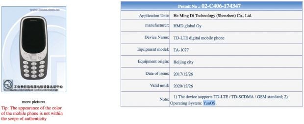 Das Nokia 3310 (2018) kommt mit Yun OS (Android-Fork) und 4G. (Bild: Phoneradar; TENAA)