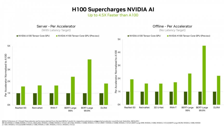 Die neuen H100-Grafikkarten sollen der Nachfolger der aktuellen A100-Generation mit Ampere-Architektur werden. Darum hat Nvidia die H100 auch gegen ihren Vorgänger antreten lassen und zwar im sogenannten MLPerf-Benchmark, welcher der Industriestandard für KI-GPUs ist.