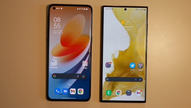 Abgerundet vs. eckiger: Oppo Find X5 Pro neben Samsungs Galaxy S22 Ultra. Das Find X5 ist auch etwas schmaler als das S22 Ultra. (Foto: t3n)