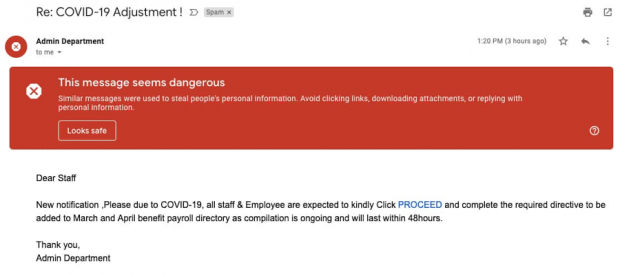 Beispiel für eine Phishing-Mail mit Coronabezug. (Screenshot: Google)