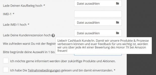 „Teilen macht Spaß” heißt eine Aktion, die einen Kickback unter anderem von einer Amazon-Rezension abhängig macht. Ob das „jede Art” auf die Ausführlichkeit oder das Ergebnis der Bewertung bezieht, bleibt offen. (Bild: Huawei/Honor)