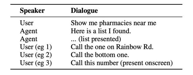 Als Beispiel wird die KI per Sprachbefehl angewiesen, Apotheken in der Nähe anzuzeigen. Daraufhin wird dem Benutzer oder der Benutzerin eine entsprechende Liste angezeigt. Aus dieser kann mit verschiedenen natürlichsprachlichen Befehlen eine Apotheke ausgewählt und angerufen werden. Zum Beispiel: „Rufe die in der Regenbogenstraße an“ oder „Rufe die Unterste an“. Wenn auf dem Bildschirm nur eine Telefonnummer angezeigt wird, genügt es auch, dem Assistenten zu sagen, dass er diese anrufen soll.