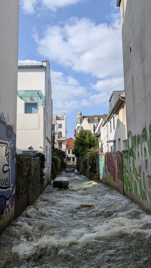 KI-Manipulation mit Reimagine: Eine kleine Gasse wird zum Fluss mit Bootsbetrieb. (Bild: t3n)