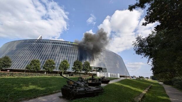 KI-Manipulation mit Reimagine: Mit wenigen Prompts stehen plötzlich Panzer vor dem brennenden Weserstadion. (Bild. t3n)