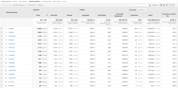 Im ersten Schritt wird die Bildschirmauflösung analysiert. Dafür gibt es in Google Analytics schon einen passenden Report für die Bildschirmauflösung, zu finden unter Zielgruppe > Technologie > Browser & Betriebssystem – primäre Dimension: Bildschirmauflösung.