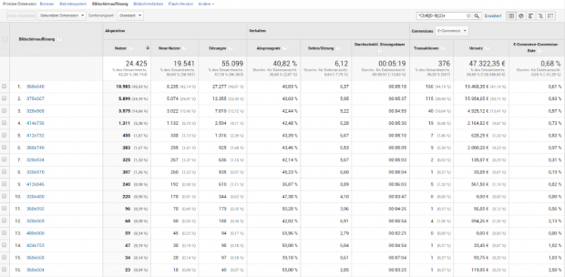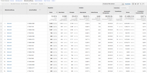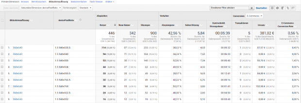 Lohnt es sich dann also überhaupt, Bildgrößen von 360 Pixel Breite bereitzustellen? Schaut doch einfach mal nach und filtert die Dimension devicePixelRatio nach „Beginnt mit 1“: