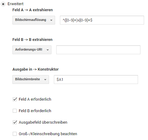 Über eine sogenannte Custom Dimension lässt sich die Breite von Bildschirmen in Google Analytics einspielen. Damit hat man eine wesentlich sauberere Datenbasis, denn die Höhenangabe fragmentiert die Breitenangaben (beispielsweise 320×568, 320×570, 320×480 aus dem Beispiel oben), welche man zunächst aufwendig summieren müsste. Um dies zu erreichen, muss lediglich eine Custom Dimension „Bildschirmbreite“ auf Hit-Level gesetzt, und folgender Filter implementiert werden: