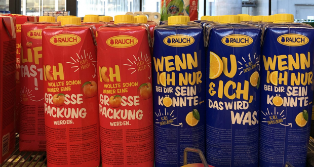 Der nette Saft von nebenan: Der österreichische Fruchtsafthersteller Rauch lockt die Kunden mit frechen Sprüchen und typografischem Slang. (Foto: Jürgen Siebert)