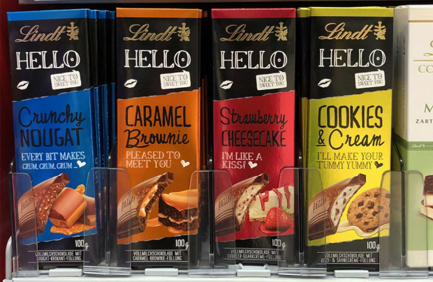Die forsche Schoko-Linie Hello von Lindt inszeniert sich mit einem jugendlichen Lettering-Schriftmix. (Foto: Jürgen Siebert)