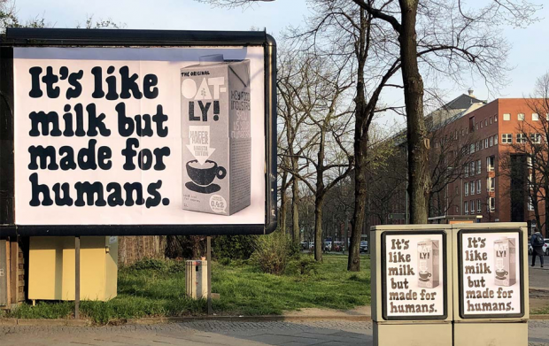 Wie Schrift, aber für eine (vegane) Leserschaft gemacht: Der Hafermilch-Erfinder Oatly inszeniert sich in seiner jüngsten Kampagne als Kumpel von nebenan. (Foto: Jürgen Siebert)