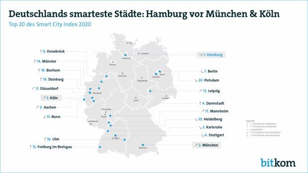 Wie schon im letzten Jahr bleibt Hamburg nach Punkten an der Spitze und kann damit den Titel als „smarteste“ Stadt Deutschlands verteidigen. Nach Ansicht des Digitalverbands ist die Hansestadt der Konkurrenz vor allem in den Bereichen Mobilität und digitale Bürgerbeteiligung besonders gut aufgestellt. Lobend heben die Autorinnen und Autoren des Smart-City-Index die Multimodalitäts-App der Hamburger Verkehrsbetriebe hervor.
