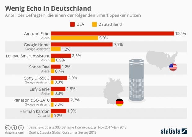 Amazon und Google sind extrem zurückhaltend, wenn es um die Verkaufszahlen ihrer smarten Lautsprecher geht. Beide Anbieter geben keine genauen Zahlen preis und unterscheiden schon gar nicht zwischen den einzelnen Ländern. Eine von Statista durchgeführte Onlinebefragung gibt hier einen Einblick in die Marktverteilung. In den USA sind smarte Lautsprecher demnach deutlich stärker verbreitet als in Deutschland.