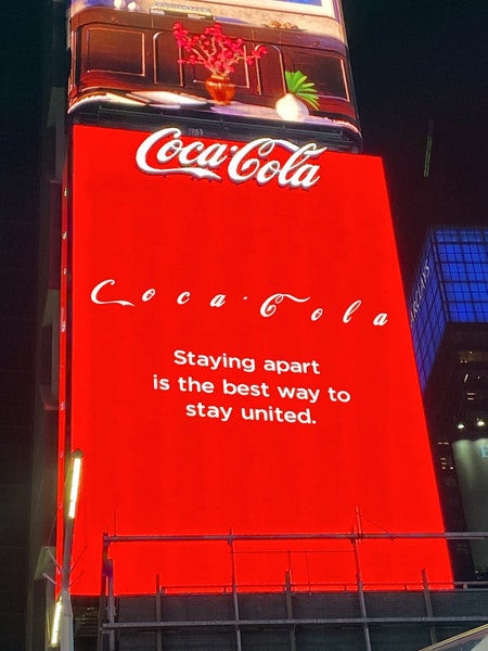 Auch Coca-Cola schaltet derzeit eine Anzeige auf dem gespenstisch leeren New Yorker Times Square. Jeder Buchstabe des Logos ist dabei deutlich sichtbar von den anderen getrennt. Unter dem abgewandelten Logo ist ein Slogan zu lesen, der sich mit „Sich nicht nah zu kommen, ist der beste Weg, verbunden zu bleiben“ übersetzen lässt.