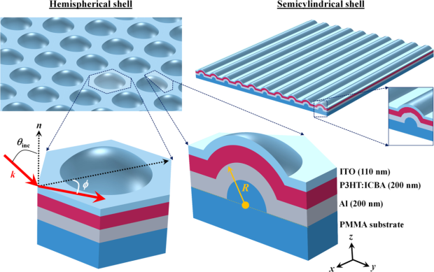 Nun hat ein Wissenschaftler der Abdullah-Gül-Universität in Kayseri (Türkei) der Idee der flachen Solarzelle eine wortwörtliche Delle verpasst. In der Studie von Dooyoung Hah untersuchte der Forscher „halbkugelig-schalenförmige“ Photovoltaik- Zellen. Die Zellen bestehen aus einem organischen Polymer namens P3HT:ICBA und liegen über einer Aluminiumschicht und einem PMMA-Substrat, das mit einer transparenten Schutzschicht aus Indiumzinnoxid (ITO) abgedeckt ist.