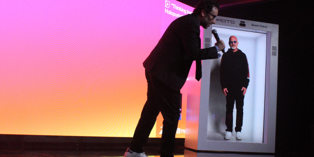 Die Systeme von Proto sind holographische Anzeigegeräte, die ein Hologramm eine:r Gesprächspartner:in auf einem transparenten Monitor anzeigen, sodass es aussieht, als schwebte die „Person“ im Raum.