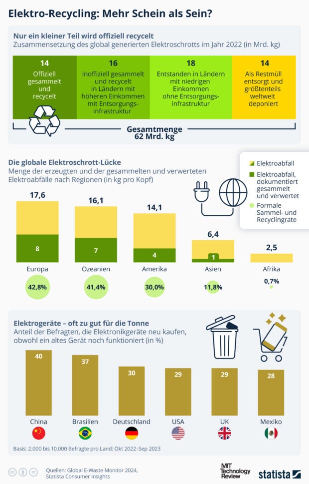 Diese Lücke zwischen offiziellen und inoffiziellen Sammel- und Recyclingstatistiken unterscheidet sich zwischen den verschiedenen Weltregionen mitunter stark, wie die Infografik von Statista zeigt. Am höchsten ist der Anteil der formalen Sammel- und Recyclingrate mit rund 43 Prozent in Europa, am geringsten dagegen in Afrika mit 0,7 Prozent. In Afrika ist die insgesamt erzeugte Menge Elektroschrott allerdings auch am geringsten – pro Kopf werden hier nur 2,5 Kilogramm des elektronischen Abfalls erzeugt. Europäer hingegen sind pro Einwohner für rund 17,6 Kilogramm Elektroschrott verantwortlich.