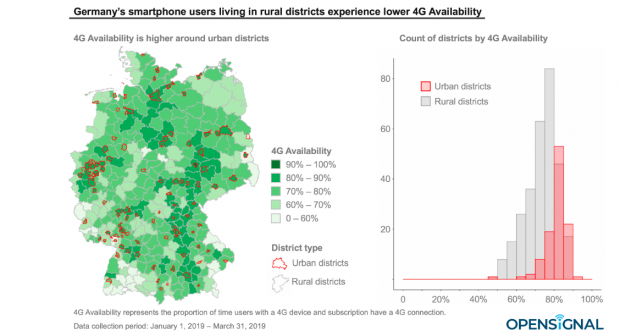 Eine Karte und ein Säulendiagramm zur 4G-Verfügbarkeit im 1. Quartal 2019. Grundsätzlich ist das 4G-Netz in Städten und Ballungsräumen besser als in ländlichen Regionen. (Grafik: Opensignal)