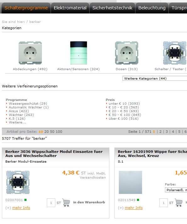 Die grundsätzliche Eingleisigkeit der Lösung kann im Vergleich zu Wörtbuch-basierten Lösungen nur dann gut funktionieren, wenn das Warenangebot relativ homogen ist. Wie man am Beispiel Esprit gut sehen kann, unterscheiden sich die Ansichten bei der Vorgehensweise mit und ohne Suche nur unwesentlich. Das kann allerdings auch daran liegen, dass Esprit möglicherweise einen Teil der Navigation über FACT-Finder abbildet, was in der Form nur mit wenigen Suchtechnologien möglich ist. Dennoch würde ich das Ergebnis nicht als überzeugend im Vergleich zu beispielsweise Celebros bezeichnen.