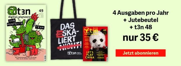 Noch kein t3n-Abo? Dann aber schnell! Wenn du jetzt bestellst, erhältst du die Ausgabe 48 und unseren brandneuen Jutebeutel gratis dazu. Die Aktion läuft noch bis zum 1. September 2017.
