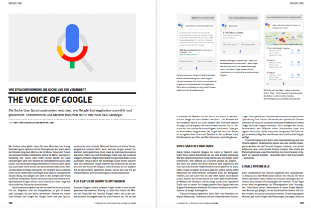 Eine Evolution findet derzeit auch in Suchmaschinen statt. Nutzer fragen immer häufiger ihren digitalen Assisten um Rat, statt Text in ein Suchfeld einzugeben. Das beeinflusst auch die SEO-Strategie von Unternehmen. Für Designer bedeutet der Trend gleichzeitig, dass sie ein neues User-Interface gestalten müssen. In der t3n 49 beleuchten wir in dem Text „The Voice of Google“ und „Perfekt abgestimmt“, was dabei wichtig ist. Außerdem zeigen wir, wie Unternehmen am besten auf Amazon werben und wie Händler mit schlechten Bewertungen umgehen sollten. Für die Entwickler geben wir zudem einen Einführungskurs in Googles Programmiersprache Go und erklären gutes Onboarding-Design für Apps.