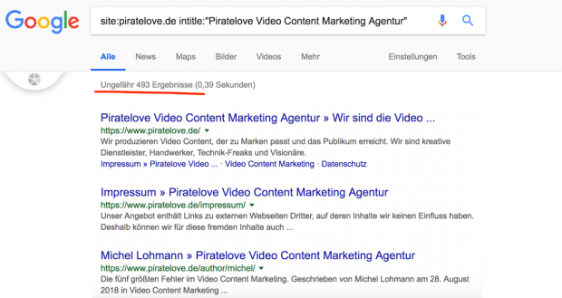 Google hat 493 Seiten von piratelove.de indexiert, die den Firmennamen im Seitentitel enthalten (Screenshot: google.com)